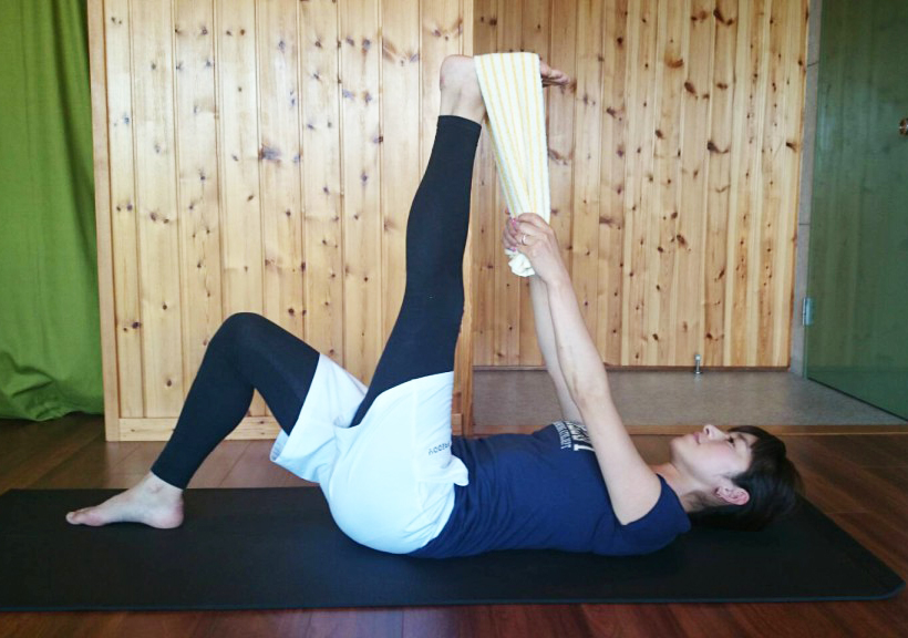 タオルを足の裏にかけ両手で下に引っ張るようにしてサポートします。余裕があれば、足の裏でタオルを天井の方へ押し出すようにします。