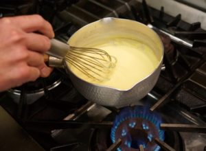 - 2を火から下し、ふやかしておいたゼラチンを入れてしっかり溶かしよく混ぜる。