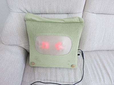 最近テレビでも話題の、おしゃれなマッサージクッションです。見た目は普通のクッションですが、カバーをめくると、モミ玉がついています。