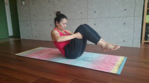 2、両足を床から浮かせ、腹を引き上げながら、お腹を覗き込むようにして背中をアルファベットのCの字のように丸めます。