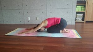 4、四つ這いを通過してお尻をかかとの上にのせ、背中をストレッチします。