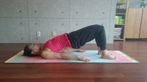2、お腹に力を入れお腹と背中を一つにして、肩から膝までが一直線になるようにお尻を床から持ち上げます。
