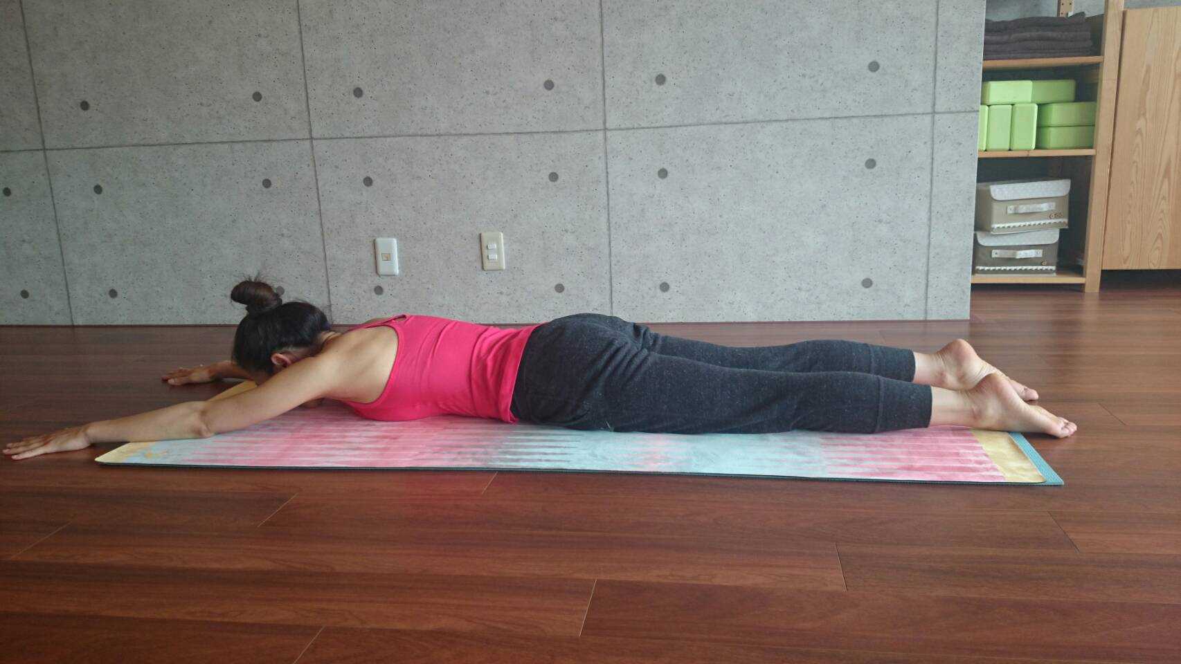 1、うつ伏せで両手は肩幅、両脚は腰幅に開きます。鼻でバランスをとるようにして、首の後ろも伸ばします。