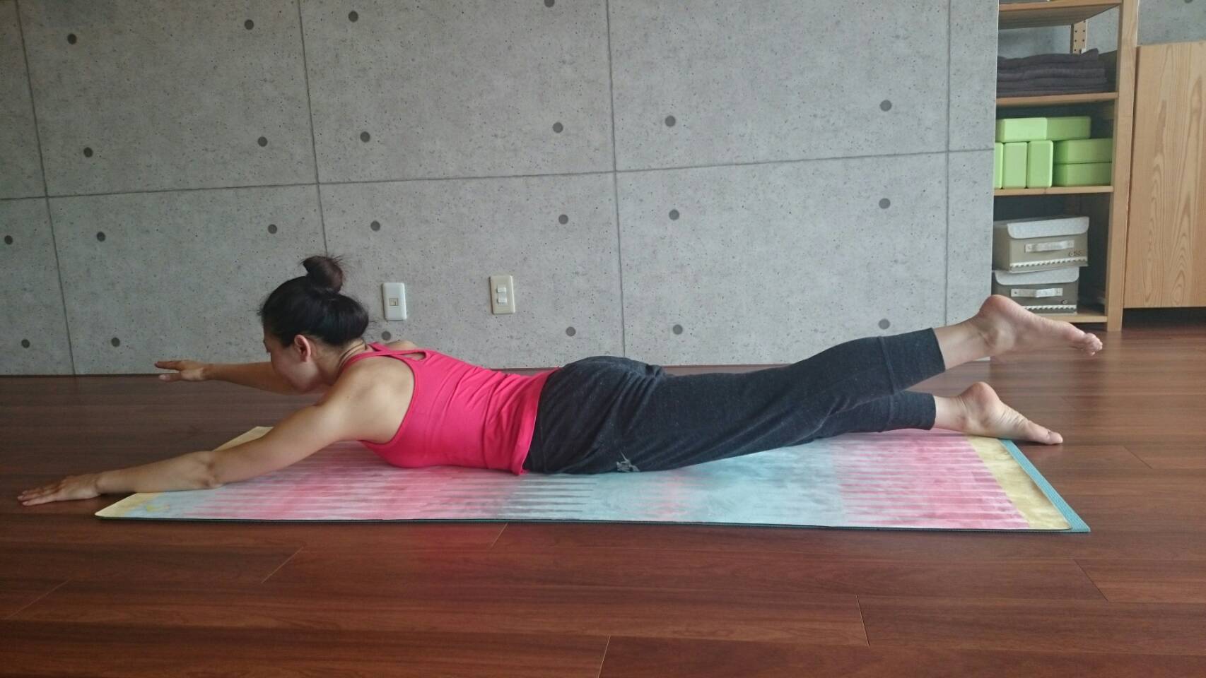 まるでスイミングをするようにして、背骨を伸ばしながら強化します。