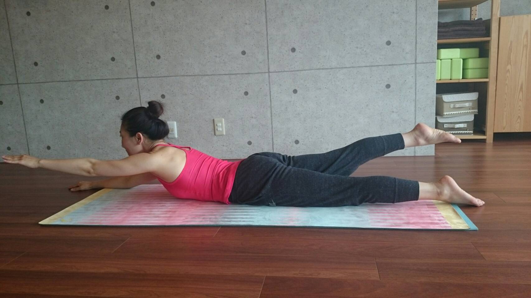 2、腹を中に上に引き上げながら、右手と左脚をペアにして長く伸ばしながら持ち上げます。