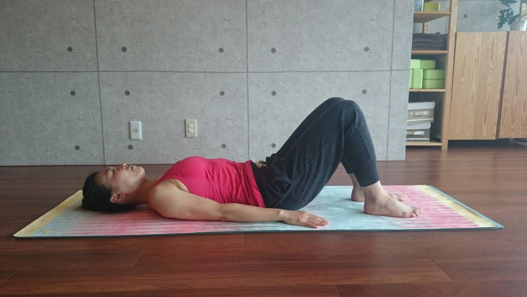 1、仰向けになり膝を立てます。両足は腰幅に開きます。