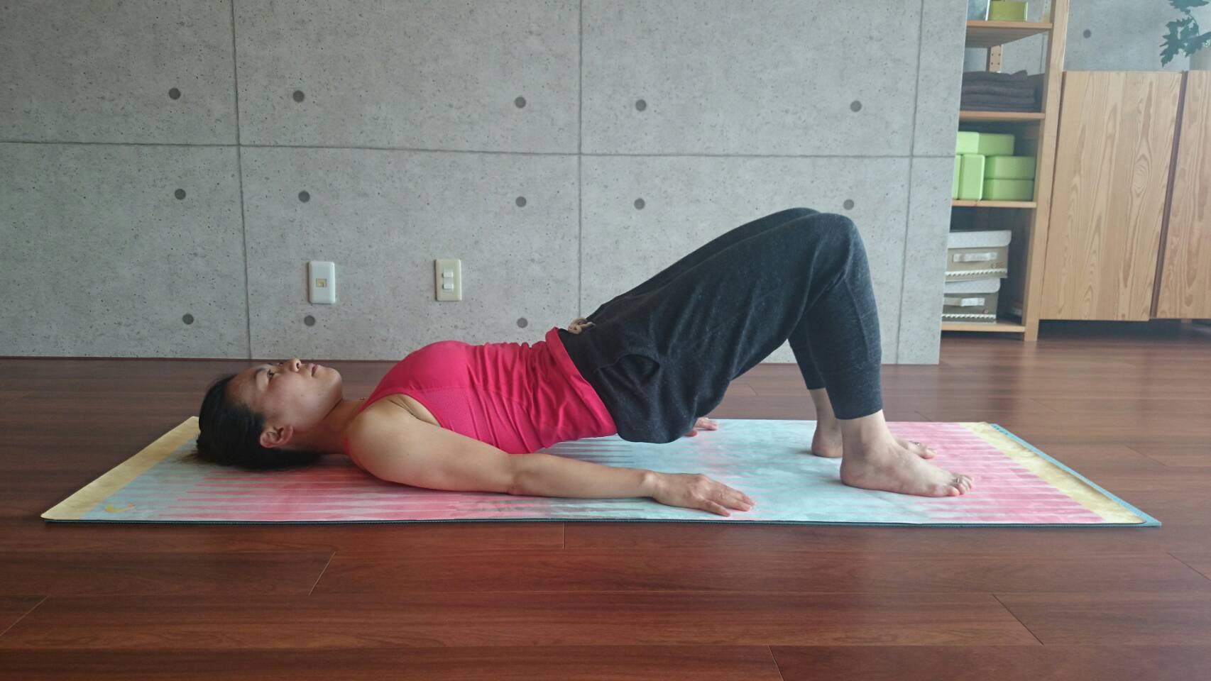 2、お腹に力を入れお腹と背中を一つにして、肩から膝までが一直線になるようにお尻を床から持ち上げます。