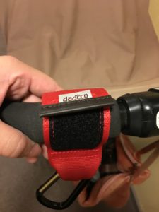 かちっとカタビナの部分を押して荷物をひっかけるだけ。取って部分に取り付けるマジックテープの部分もかなり頑丈に作られています。