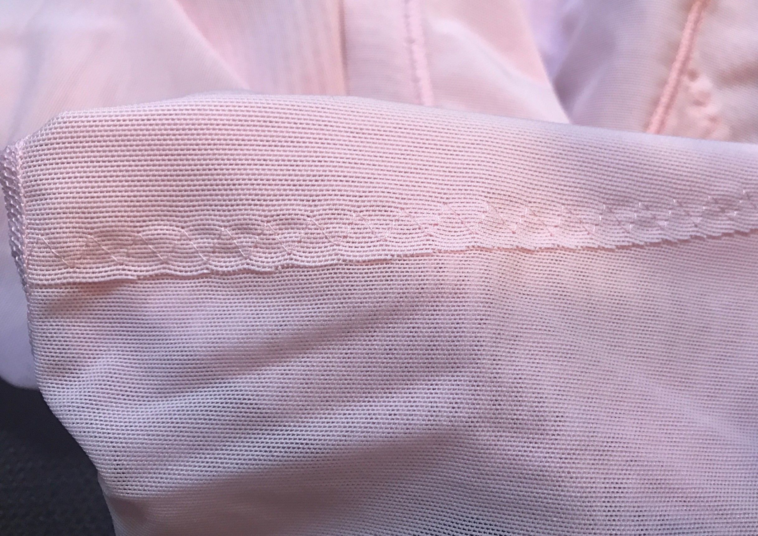 素材はザ・メッシュといった感じで、色が白かったらすごく目の細かい高級洗濯ネットじゃないかという外見で・・・ぶっちゃけ高級感は皆無です。3枚の生地を縫い合わせているんですが、内側の生地は切りっぱなしで、よく言えばアウターに響きにくい、悪く言えば安物感が丸出しの印象でした。