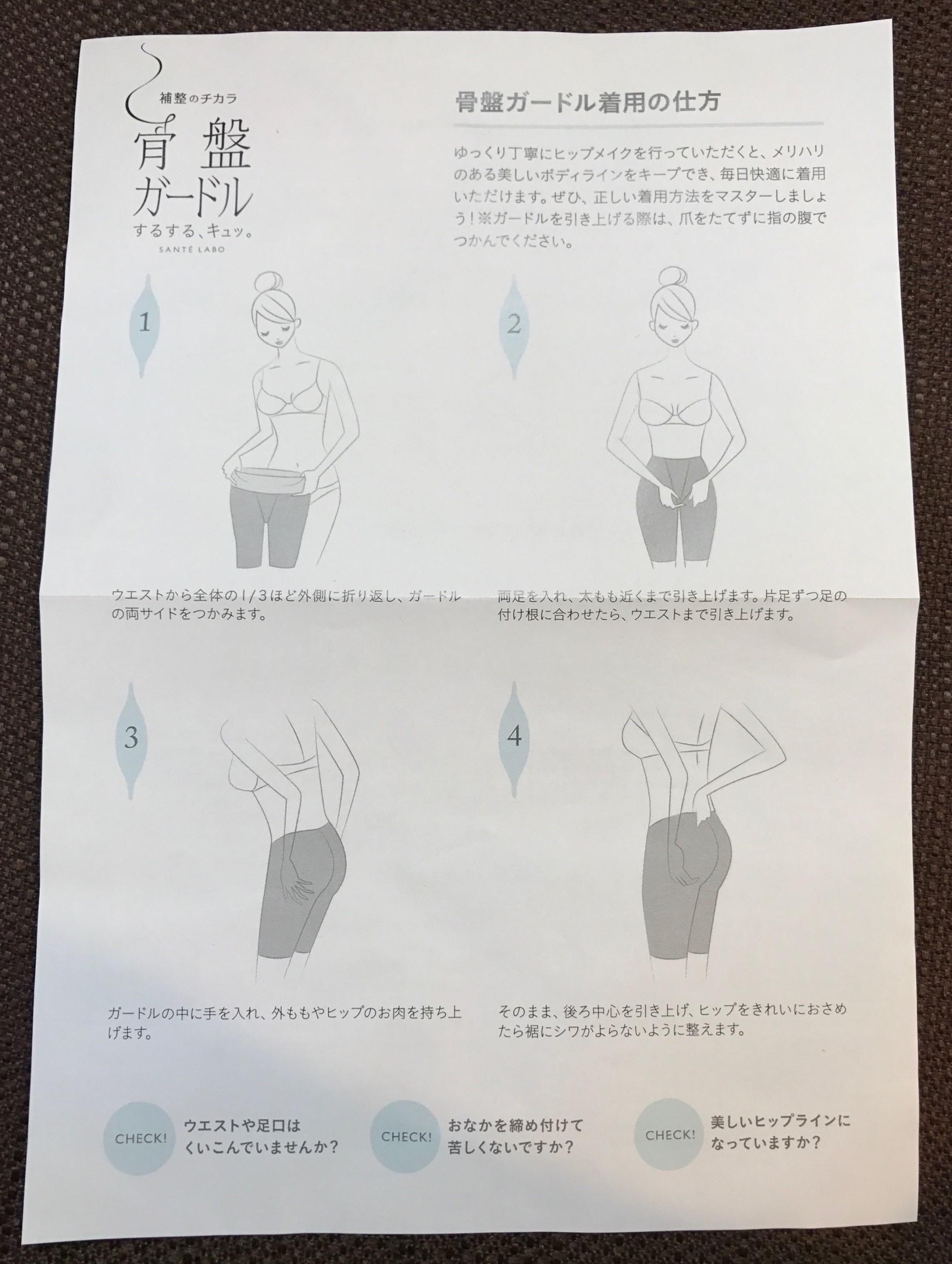 途中で引っかかりやすいので股部分をフィットさせるためにウエストをぐいぐい引っ張るので、これ破けたらどうしよう・・・とちょっと不安になったりも。が、その後、商品と一緒に入っていた「骨盤ガードル着用の仕方」