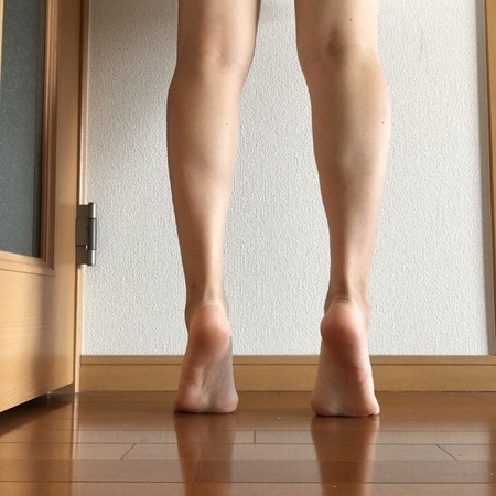 - 足を肩幅に開いたらゆっくり爪先立ちをします。