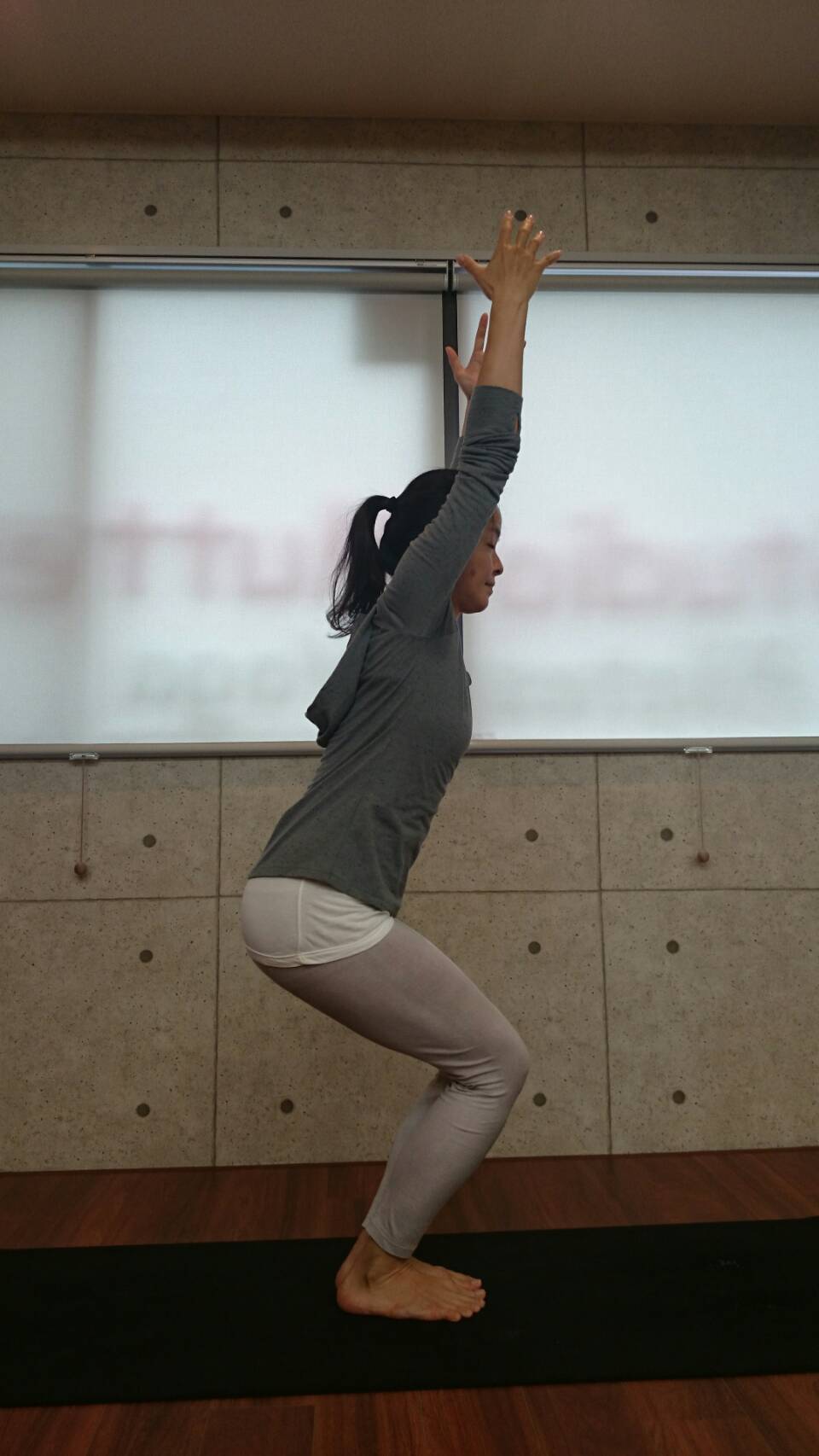 3.腰を落としたまま、ゆっくりと息を吸いながら両腕を上にあげ、3~5呼吸キープします。