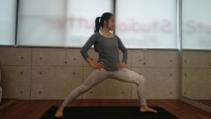 2、息を吸って背すじをのばし、吐きながら左ひざを直角に曲げ、重心を前に移動します。