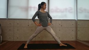 1、足を肩幅より広く開いて立ちます。右足のつま先は正面に向け、左足のつま先は90度外側へ向けます。左足のかかとから右足の土踏まずが一直線になるようにしましょう。