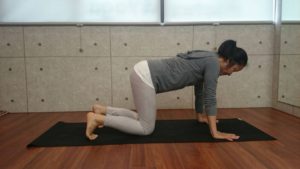 1、両手は肩幅、両膝は腰幅に開いて四つ這いになります。